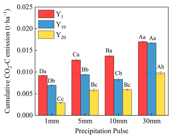 Cumulative CO2-C emission of soil respirable C within 72 h after precipitation. Note: The presence of prominent capital letters indicates statistically significant differences in CO2-C emissions across various precipitation conditions, with a significance level of p < 0.05. Similarly, the occurrence of a distinct lowercase letter signifies a statistically significant difference in CO2-C emissions between different years of gravel-mulched tillage.
