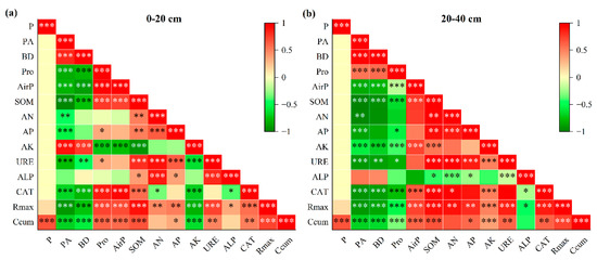 Correlation of precipitation, planting ages, soil physicochemical properties, and enzyme activities in 0–20 cm (a) and 20–40 cm (b) soils. P, precipitation; PA, planting age; BD, bulk density; Pro, soil porosity; AirP, soil air permeability; SOM, soil organic matter; AN, available nitrogen; AK, available potassium; AP, Available phosphorus; ALP, alkaline phosphatase; CAT, catalase; URE, urease; Rmax, maximum rate of CO2-C emission; Ccum, the cumulative CO2-C emission. Note: * p < 0.05, ** p < 0.01, *** p < 0.001.