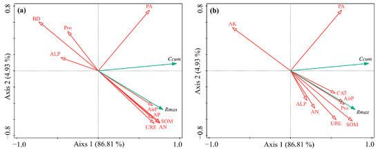 The RDA results indicated that the Ccum and Rmax were closely linked to the changes in soil properties (Figure 5). In the 0–20 cm soil layer, axes 1 and 2 explained 86.81% and 4.93%, respectively (Figure 5a). It was shown that SOM had the strongest correlation with Axis 1, and the correlation coefficient was 0.52. The permutation test analysis results showed that SOM, PA, and ALP were the key factors that explained the variations in Ccum and Rmax (p < 0.05, Figure 5a). In the 20–40 cm soil layer, axes 1 and 2 explained 86.81% and 4.93%, respectively (Figure 5b). It was shown that SOM had the strongest correlation with Axis 1, and the correlation coefficient was 0.52. The permutation test analysis results showed that SOM, PA, and AirP were the key factors that explained the variations in Ccum and Rmax (p < 0.05, Figure 5b).