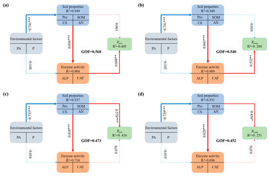 Structural equation modeling of soil respiration as a function of planting ages and precipitation variability: (a,b) the 0–20 cm soil layer; (c,d) the 20–40 cm soil layer. Note: Numbers adjoining the arrows indicate standardized path coefficients, and the arrow width is proportional to the strength of the association. The red arrow represents the positive correlation, and the blue arrow is the negative correlation. Asterisks indicate significance (* p < 0.05, ** p < 0.01, *** p < 0.001), and the absence of any marker shows no significance. Variance inflation factors (VIF), coefficient of determination (R2), common factor variance (Q2), and goodness of fit (GOF) are shown. PA, planting ages; P, precipitation; ALP, alkaline phosphatase; CAT, catalase; Pro, soil porosity; SOM, soil organic matter; CS, clay and silt; AN, available nitrogen; Rave, average rate of soil respiration; Rcum, cumulative of maximum rate of soil respiration.