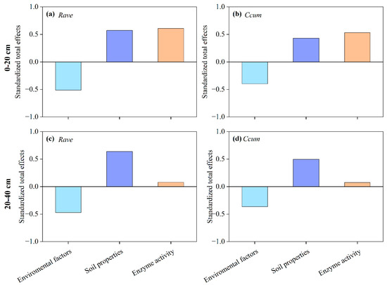 In order to evaluate the impact of planting ages and precipitation on soil properties, enzyme activity, and soil respiration, we applied a PLS-PM model to understand what factors influence soil respiration. Environmental factors directly drive changes in soil properties and enzyme activity, thereby affecting changes in the Rave and Ccum (Figure 6). In the 0–20 cm soil layer, the environmental factors indirectly affect the Rave and Ccum by altering the enzyme activity significantly (p < 0.01; Figure 6a,b), whereas the environmental factors indirectly affect the Rave and Ccum by altering the soil properties significantly (p < 0.05; Figure 6c,d). The standardized total effects of enzyme activity were greater than the environmental factors and soil properties on the Rave and Ccum in the 0–20 cm soil layer, while the standardized total effects of soil properties were greater than the environmental factors and enzyme activity on the Rave and Ccum in the 20–40 cm soil layer (Figure 7).