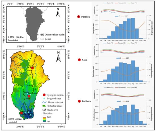 The research was conducted in the Ouémé River basin in West Africa, an area known for its significant agro-hydrological potential. This region is drained by the Ouémé River, which spans 510 km in length. At the Bonou outlet, the basin encompasses an area of 49,256 km2, situated between latitudes 10°09′33″ N and 6°20′14″ N and longitudes 1°30’E and 2°30′ E (Figure 1) [32]. The topography of the basin is generally flat, with an average slope ranging from 0.9 m/km to over 2% [11]. The study area exhibits three distinct rainfall patterns [33]: (i) a unimodal regime in the north, characterized by a rainy season from May to October and a dry season, typical of the southern Sudanese climate; (ii) a bimodal regime in the south, featuring two wet seasons, a longer one from March to July and a shorter one from September to mid-November, as well as a prolonged dry season from November to March, representative of the Sudano–Guinean (sub-equatorial) climate; and (iii) a transitional regime in the central region, resembling the climate observed in Benin, marked by a rainy season spanning from March to October, occasionally with a brief dry spell in July and August. The average annual precipitation across the basin ranged from 900 to 1300 mm during the period ranging from 1951 to 2015 [33]. Over the period ranging from 1991 to 2021, the mean annual temperature fluctuated between 26 and 30 °C (Figure 1). The predominant land cover in the study area is savannah, representing 64% and 60% of the catchment area in 2000 and 2013, respectively. However, this vegetation has significantly declined in favor of agricultural land, which increased by 8.1% during the period of 2000–2013 [32]. Small-scale rainfed agriculture is prevalent in the study area [11]. During the dry season, which generally extends from November to March, water availability for crops becomes a significant challenge [8]. Consequently, agricultural activities are primarily observed on irrigated areas during this period [10]. Three categories of irrigation have been identified in the basin area: (1) urban and peri-urban irrigation based on vegetable production (onions, tomatoes, chillies, okra, carrots, etc.) near major cities, (2) small-scale irrigation in inland valleys (lowlands and floodplains), and (3) large-scale irrigation systems for rice, sugarcane, and palm oil production [3,8].