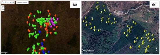 (a) Land use and land cover sampling points (red: built-up area and bare land; blue: water body; green: vegetation; purple: agricultural area) from GEE; (b) irrigated area sampling points (yellow) from Google Earth Pro.