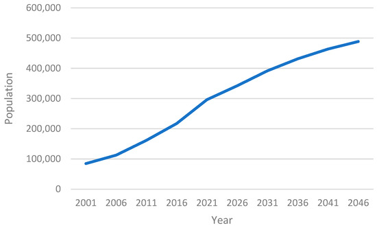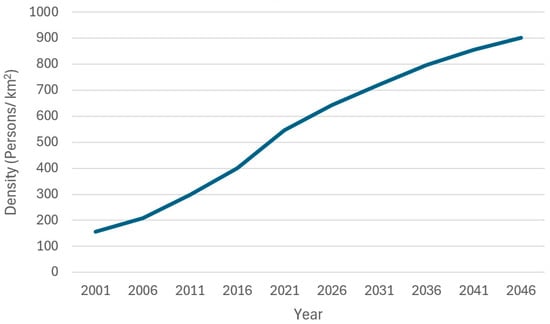 Local Government Areas (LGAs) in the west of Melbourne include Wyndham, Melton, Brimbank, Moonee Valley, Hobsons Bay, and Maribyrnong (Figure 1). Among them, Wyndham is one of the fastest-growing municipalities in Melbourne [48]. The population of Wyndham has been significantly increased from less than 90,000 in 2001 to over 300,000 in 2024 and is projected to reach nearly 500,000 by 2046 [49] (Figure 2). Within an area of 541.8 km2, the population density of Wyndham has increased from 157 persons/km2 to around 600 persons/km2 in 2024, which is estimated to be over 900 persons/km2 by 2046 [50] (Figure 3).