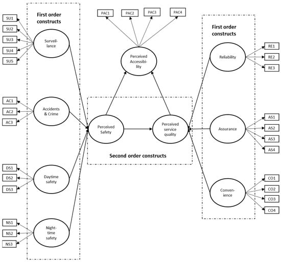 PLS-measurement model depicting the hypotheses of the direct and indirect effects of perceived safety and service quality on perceived accessibility.