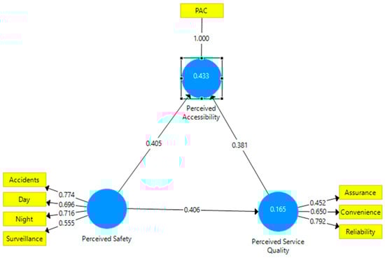 PLS-SEM structural model depicting the relationship between perceived safety, service quality, and accessibility.