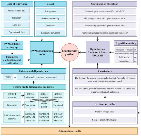 The flow and main steps of this study are illustrated in Figure 1. The first step was future scenario settings and rainfall simulations. After nine multi-dimensional scenarios were divided by coupling the SSP-RCP scenarios and time series, rainfall data under various multi-dimensional scenarios were obtained by referring to CMIP 6 and drawing support from the multi-model ensemble mean method. The second step was the development of the stormwater management model and stormwater simulation. The stormwater management model of the site was established based on the site status and drainage network data, and the parameters were calibrated and verified. Then, the appropriate CGGI (storage tanks, bioretention facilities, permeable pavements, and green roofs) and future rainfall data were added to the model for stormwater simulation. The final step was the establishment of a multi-objective optimization framework based on NSGA-III. The four optimization objectives were economic performance, hydrological recovery, water quality protection, and stormwater resource utilization, which were quantified by life cycle cost, runoff control rate, pollutant reduction rate, and total node overflow, respectively. After setting the decision variables, constraints, and algorithm parameters, the Python programming language was edited on the JupyterLab platform [] to couple the stormwater management model and NSGA-III to realize automatic optimization of the CGGI.