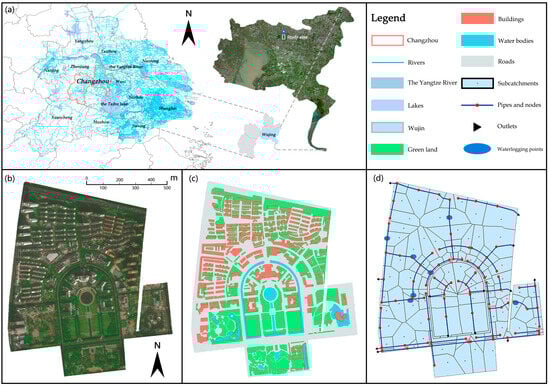 Overview map of the study area, including (a) a distribution map of water systems of the Yangtze River Delta and the location of the study area in the Yangtze River Delta, Changzhou, and Wujin; (b) a satellite map of the study area; (c) a distribution map of the underlying surfaces of the study area; (d) a generalized SWMM of the study area.