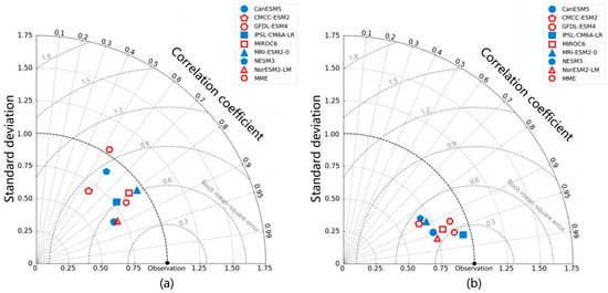Taylor plots of different climate models during the verification period. (a) Before calibration. (b) After calibration.