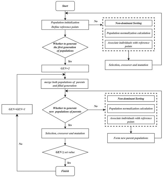 The selection of the algorithm parameters referred to related studies [,,]. The interaction coefficient and variation coefficient were determined as 0.8 and 0.09, respectively. To ensure that the algorithm could effectively explore the space and converge to the optimized solution set, a population of 300 individuals was set, and an iterative operation was performed for 400 generations. A flowchart of the NSGA-III algorithm is shown in Figure 4.
