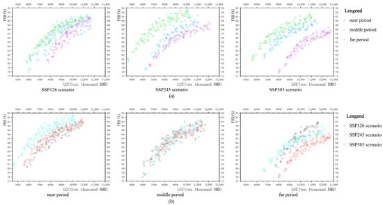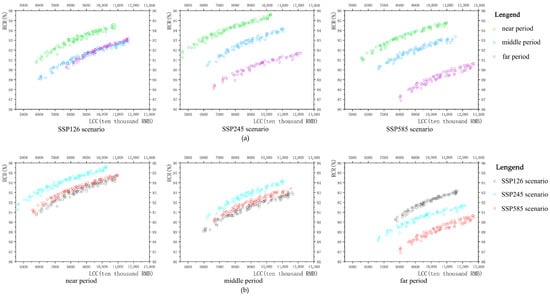 The water quality optimization effects of the SSP-RCP scenario dimensions are shown in Figure 6a. In general, under all three SSP-RCP scenarios, the optimization schemes of the near period were almost always at the top and the optimization schemes of the middle and far period were almost always at the middle and bottom, respectively. It can be seen that the PRR of the near period was almost always greater than that of middle and far period, which also means that the best water quality protection effect was most likely in the near period. Under the SSP126 scenario, with gradual investment in LCCs, the difference in the achievable PRR in the three stages was not large. Under the SSP245 scenario, the difference in the achievable PRR in the three stages was more evident, and the optimization schemes of the near period were significantly higher than those of the middle and far period, indicating that the water quality protection effects of the near period were significantly greater than that of the middle and far period. In terms of specific values, the maximum PRR of the SSP245-N, SSP245-M, and SSP245-F scenarios were 92.79%, 91.28%, and 89.71%, respectively, indicating that the SSP245-N scenario had the best water quality protection potential. When the cost was lower, the difference in the PRR between the middle and far period was not large. With gradual investment in LCCs, the difference in the PRR between the middle and far period gradually widened. Under the SSP585 scenario, the difference in PRR among the three stages was the most obvious, and the optimization schemes of the far period were significantly lower than those of the near and middle period, indicating that the water quality protection effects of the far period were significantly worse than those of the near and middle period. In terms of specific values, the maximum PRR values of the SSP585-N, SSP585-M, and SSP585-F scenario were 91.56%, 90.13%, and 88.23%, respectively, indicating that the SSP585-N scenario had the best water quality protection effects. In short, the influence of time series on water quality protection presented as near period > middle period > far period.