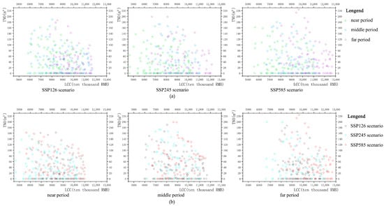 The stormwater resource utilization optimization effects of the SSP-RCP scenario dimension are shown in Figure 7a. Overall, under the three SSP-RCP scenarios, the optimization schemes in the near, middle, and far period were relatively on the left, centre, and right, showing that the maximum cost of achieving the same stormwater resource utilization effect was most possible in the far period and almost impossible in the near period. Moreover, in each graph, optimization schemes generating a larger TNO were primarily from the far period, with fewer coming from the near period; additionally, under three SSP-RCP scenarios, the optimization effect of stormwater resource utilization was expressed as far period > middle period > near period. The maximum TNO achievable under the SSP126-N, SSP126-M, and SSP126-F scenarios were 162 m3, 189 m3, and 186 m3, respectively; the maximum TNO achievable under the SSP245-N, SSP245-M, and SSP245-F scenarios were 150 m3, 173 m3, and 199 m3, respectively; and the maximum TNO achievable under the SSP585-N, SSP585-M, and SSP585-F scenarios were 162 m3, 180 m3, and 224 m3, respectively. In general, in terms of stormwater resource utilization, the potential of the far period was the greatest, while the near period had the worst stormwater resource utilization potential.