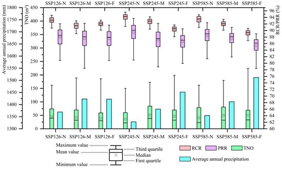 The hydrological recovery optimization effects of the time-series dimension are shown in Figure 5b. In the near and middle period, the optimization schemes of the SSP126 scenario were always at the top, those of the SSP585 scenario were always at the bottom, and those of the SSP245 scenario were always in the middle. Overall, the SSP245 scenario had the best runoff control effect in the near and middle period and the SSP126 scenario had the worst. Numerically speaking, in the near period, the ranges of available RCR for the SSP126-N, SSP245-N, and SSP585-N scenarios were 90.73–94.62%, 91.25–95.61% and 90.94–94.79%, respectively, and, in the middle period, the ranges of available RCR for the SSP126-M, SSP245-M, and SSP585-M scenarios were 89.05–92.97%, 90.42–94.18%, and 90.08–93.38%, respectively, also indicating that, in the near and middle period, the best runoff control effect could be achieved under the SSP245 scenario and the SSP126 scenario could achieve the worst runoff control effect. In the far period, the optimization schemes of the SSP245-F scenario remained located below those of the SSP585-F scenario; therefore, the runoff control effects of the SSP245 scenario were better than those of the SSP585 scenario at any stage. However, over time, the optimization schemes of the SSP126-F scenario rose from the bottom to top; therefore, in the far period, the SSP126-F scenario had better runoff control effects than the SSP245-F and SSP585-F scenarios. Numerically, in the far period, the RCR ranges of the SSP126-F, SSP245-F, and SSP585-F scenarios were 90.12–93.18%, 88.1–91.71%, and 86.9–90.65%, respectively, and it can also be seen that the runoff control effect of the SSP126-F scenario was the best, that of the SSSP245-F scenario was second, and that of the SSP585-F scenario was the worst. In short, the optimization effects of hydrological recovery in the near period and middle period presented as SSP245 scenario > SSP585 scenario > SSP126 scenario, and, in the far period, the optimization effects of the hydrological recovery presented as SSP126 scenario > SSP245 scenario > SSP585 scenario.