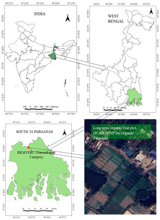 The four-year research work (2018–2021) was conducted at the University Organic Research Farm, Ramakrishna Mission Vivekananda Educational and Research Institute (RKMVERI), Narendrapur, West Bengal, India (situated at 22.438° N latitude and 88.401° E longitude) (Figure 1) falling under the Coastal Saline Zone of West Bengal. With 53.5% sand, 6% silt, and 40.5% clay, the soil texture is marked as sandy clay. Before conducting the experiments, soil samples (0–15 cm depth) were collected and analyzed. The initial values of soil physico-chemical parameters include pH of 6.93, EC (1:2.5 soil/water) of 0.19, organic carbon of 0.87%, available nitrogen of 220 mg/kg, available phosphorus of 52.64 mg/kg, and available potassium of 167 mg/kg. The climate of the coastal region of West Bengal is classified as hot and humid except for a short, mild winter in December and January. The rainfall during the experimentation period was well-distributed, with the highest amounts recorded during the monsoon season, from June to August. The total annual rainfall was 1754 mm, while the average maximum and minimum temperatures were 31.17 °C and 21.47 °C, respectively. The relative humidity varied between 37.3% to 95.5% during the experimental years (Figure 2).