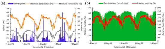 Metrological parameters (a) maximum minimum temperature, minimum temperature, and rainfall; (b) relative humidity and sunshine hour of the experimental period (2018–2022).