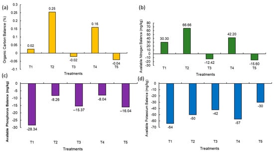 Soil OC is the key aspect of soil health and productivity. It stores nutrients and provides energy for soil organisms. The balance of OC in post-harvest soil was found to be at maximum due to the integration of organic and natural inputs (+0.25%) (NM2) followed by the addition of natural, organic, and inorganic treatments (+0.16%) (NM4) and fully organic input treatment (+0.02%) (NM1) (Figure 3a). Fully inorganic (NM5) and integration of organic and inorganic treatment (NM3) showed a decline in organic carbon balance as compared to the initial soil by 0.04% and 0.02%, respectively (Figure 3a). A similar result was also observed in the available nitrogen balance; the highest positive balance (+66.66 mg/kg) in the treatment where organic and natural inputs (NM2) were combined and applied was observed, followed by the integration of organic, natural, and inorganic inputs (+42.28 mg/kg) (NM4) and fully organic treatment (+30.30 mg/kg) (NM1) (Figure 3b). The negative balance of available nitrogen was observed in fully inorganic (NM5) and integration of organic and inorganic nutrient treatment (NM3) (Figure 3b). Irrespective of various treatment combinations, the available soil phosphrus balance was found to be negative, and the least negative value (−8.04 mg/kg) was observed with 25% organic inputs + 25% inorganic inputs + natural inputs (NM4) (Figure 3c). The soil available potassium balance also showed a declining trend in all the treatments with a maximum negative balance in the 100% organic treatment (−64 mg/kg) (NM1) (Figure 3d).