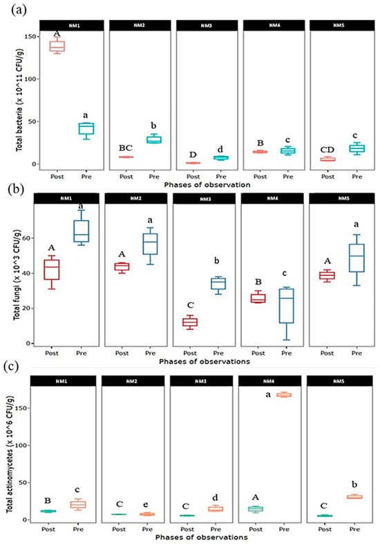 Dynamics of (a) total bacteria, (b) total fungi, and (c) total actinomycetes population in pre- and post-experimental soil. Values in parentheses represent the increase (+) or decrease (−) from the initial value (before starting the experiment). [NM1:100% organic inputs, NM2:50% organic inputs + natural inputs, NM3: 50% organic inputs + 50% inorganic inputs, NM4: 25% organic inputs + 25% inorganic inputs + natural inputs, NM5:100% inorganic inputs]. Box column followed by different letters is significantly different by Duncan’s Multiple Range Test (DMRT) at p ≤ 0.05.