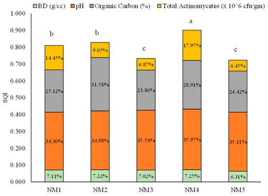 The SQI values of all individual minimum data set components were summed to achieve a single value for each nutrient treatment. Among the five treatments, SQI varied from 0.901 to 0.723 (Figure 5). The highest SQI was recorded from the integration of natural, organic, and inorganic inputs (0.901) (NM4), followed by the integration of organic and natural inputs (NM2) and 100% organic inputs (NM1), respectively. The contributions of minimum data set components were 35.97%, 28.91%, 17.97%, and 7.25% for pH, organic carbon %, total actinomycetes, and bulk density, respectively, in the highest SQI treatment. The lowest value of SQI was received from the fully inorganic treatment (NM5), which was statistically at par with the integration of organic and inorganic treatment.