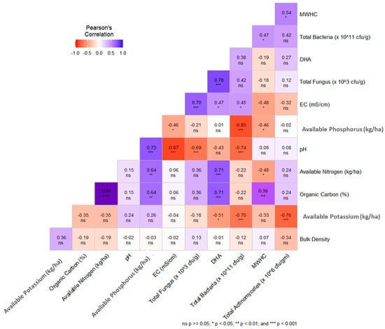 The Pearson correlation matrix between several soil physical, chemical, and biological parameters is presented in Figure 6. The OC recorded a highly positive relationship (p < 0.001) with available nitrogen content (R2 = 0.96), available phosphorus (R2 = 0.64, p < 0.01) DHA (R2 = 0.71, (p < 0.001), and maximum water holding capacity (R2 = 0.36, p < 0.01). BD builds a negative relationship with most of the soil quality parameters except soil available potassium.