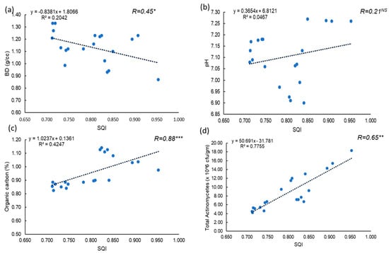 Relationship between soil quality index (SQI) and (a) Bulk density/cc, (b) Soil pH, (c) organic carbon, and (d) Total actinomycetes (×106 cfu/gm) [Abbreviation: *** correlation is significant at 0.001 level, ** correlation is significant at 0.01 level, * correlation is significant at p ≤ 0.05 level].