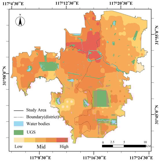 In conclusion, the areas with low location entropy in Hefei are mainly located near the old city because of the dense population and crowded land use. The rapid urbanization of Hefei has caused the construction of UGS to fail to keep up with the population growth, and there is a clear shortage of parks in high-density areas. The most serious area is located within the second ring road of Hefei. Due to the shortage of land resources, commercial and residential development often takes precedence over the construction of public UGSs, resulting in a shortage of UGSs.