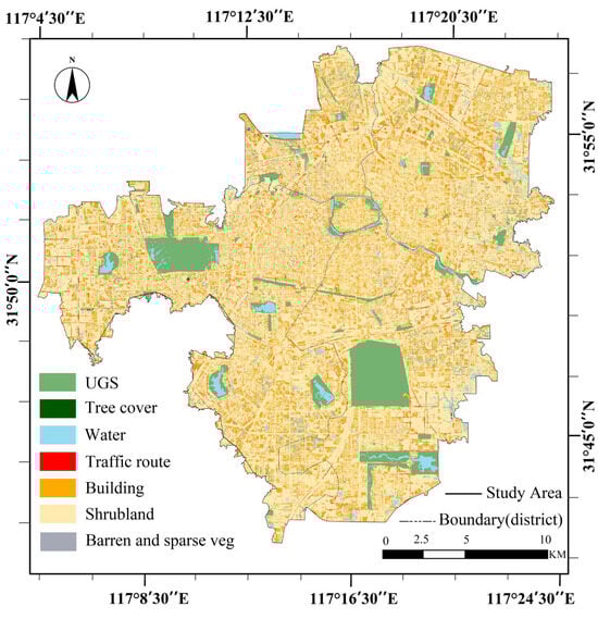 This study focuses on the built-up area of Hefei, the capital city of Anhui Province. As one of the emerging first-tier cities in China, Hefei is currently undergoing rapid urbanization, with significant emphasis on allocating resources towards urban development. In recent years, the quantity and quality of UGSs in Hefei have improved considerably. However, a notable issue remains regarding the uneven distribution of these UGSs []. Therefore, conducting an in-depth analysis of this imbalance and proposing relevant development strategies is imperative. The built-up area of Hefei exhibits high population density and rapid growth, so it serves as the primary focus of this research []. According to the “Hefei Statistical Yearbook 2021”, the total area of the built-up region was 502.50 km2 in 2020. Building on existing research, this study adheres to the principles of contiguous development and actual construction. It utilizes one-meter-resolution remote-sensing satellite imagery from 2020 to extract the specific boundaries of the built-up area through visual interpretation (Figure 1). Regarding research content, this study explicitly targets UGSs within the selected area. These include comprehensive, community, specialized, and recreational parks, as classified by the “Classification Standard for UGS” []. These UGSs will serve as the supply side for the analysis, which is the subject of study. In addition, since urban development is closely linked to economic factors and environmental conditions, it is essential to analyze the reasons for the supply and demand balance of UGSs in the built-up area of Hefei City using data on the urban GDP index [] (Figure 2) and land use types [] (Figure 3). The areas with the highest GDP index in the built-up Hefei are the main urban area and the northerly areas. The GDP index gradually decreases from the inside to the outside of the built-up area. The land-use type map shows that the built-up area of Hefei is mainly composed of buildings and shrublands, indicating that the city is undergoing rapid urbanization and expansion and may have insufficient greening construction.