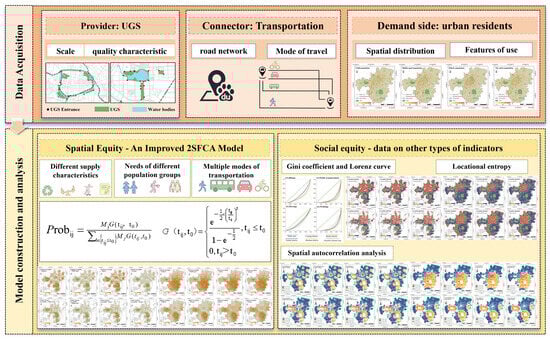 The study of spatial justice in UGSs is paramount for the research and practice of public policy related to UGS development [,]. In this supply–demand balance analysis, we consider UGSs as the supply side, assessing factors such as their size and quality. Residents represent the demand side, focusing on population distribution and age structure. Transportation modes act as the connecting element, accommodating various travel methods. We conducted a rigorous quantitative analysis using the refined 2SFCA method, Gini coefficients, Lorenz curves, location entropy, and spatial bivariate methods. This approach establishes a research framework for analyzing the equity of UGS layouts in Hefei City’s built-up areas through an empirical case study of UGS allocation (Figure 4).