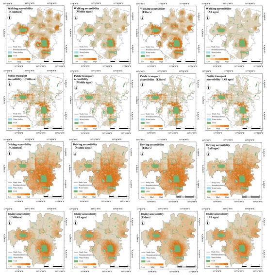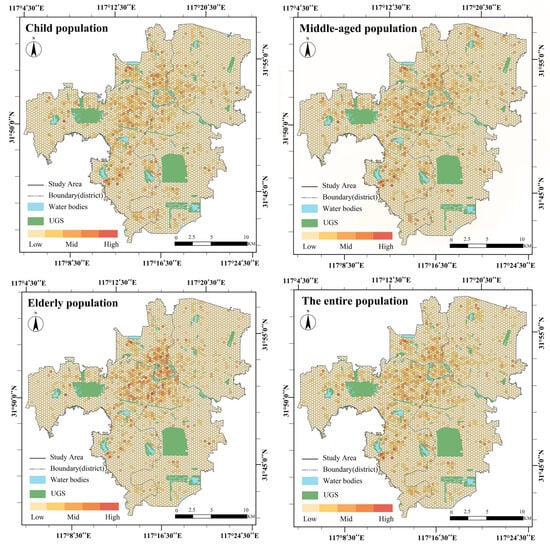 The population demand obtained by integrating signaling data and census data can be an indicator for assessing UGS demand. These data are categorized into five levels, and in an ideal model, UGS accessibility needs to match these levels hierarchically. According to Figure 5, there are certain differences in the demand distribution across different age groups. Moreover, high spatial demand is primarily concentrated in areas near the old town in Shushan District and Luyang District. There are differences in the distribution of people of different ages, with the elderly more densely distributed in the main urban areas, the middle-aged in the southwest because there are many industrial parks in that area, and the distribution of children tending to be the same as that of the middle-aged because most of the middle-aged people would choose to keep their children with them to raise them.