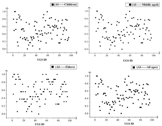 By calculating the attractiveness index of UGSs in Hefei’s built-up areas, it is found that the top 20 UGSs (Table 3) exhibit characteristics such as large-scale and comprehensive functions. However, they are widely distributed, primarily in areas away from the city center and with high population density. Judging from the results of Hefei’s attraction index, most of the UGSs with high attraction indexes are related to water, which is related to Hefei’s expectation of building an urban pattern surrounded by water. Due to certain differences in the way attractiveness indices are assessed, there are also subtle differences in the UGS attractiveness index for different age groups (Figure 6). The attractiveness index of parks for the elderly is higher than that of middle-aged people, and the attractiveness index of middle-aged people is slightly higher than that of children. This may be due to the fact that the construction of urban parks in recent years has focused on aging-friendly renovation, and the government will focus on the needs of the elderly when building UGS.