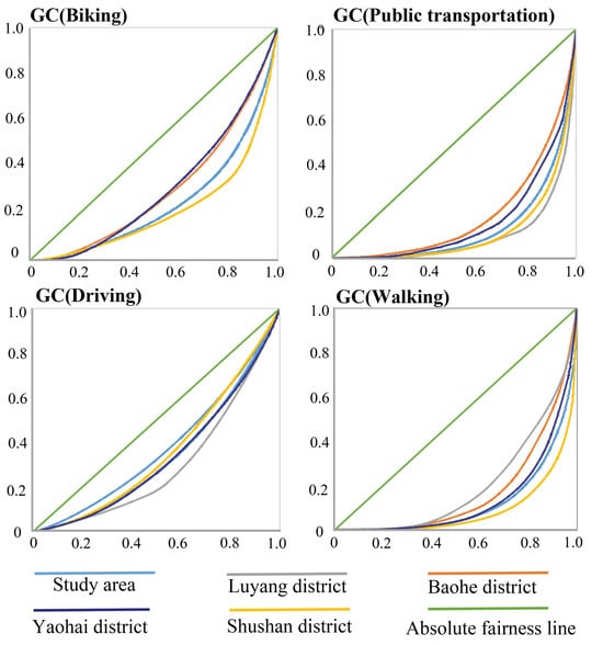By analyzing the Gini coefficients and Lorenz curves (Figure 8) of UGS distribution across different areas within the study scope, we can observe notable differences in accessibility based on different modes of transportation within the city’s built-up areas. Driving has the lowest Gini coefficient (0.33), indicating that UGS accessibility via driving is relatively equitable. In contrast, walking and public transportation have the highest Gini coefficients, at 0.76 and 0.75, respectively, suggesting highly uneven accessibility. The Gini coefficient for cycling stands in the middle at 0.51. Therefore, it can be concluded that UGS accessibility is more uneven when traveling by walking or public transport. Due to road congestion, people are more inclined to walk or use public transportation to reach UGSs in the city’s core areas. However, this choice leads to significant disparities in UGS accessibility, resulting in greater inequity for residents in these central regions when accessing UGSs.