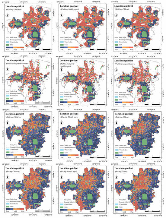 The per capita location quotient of UGSs () reveals the uneven distribution of park green space resources among urban residents (Figure 9). This article analyzes the accessibility of park green spaces for different groups based on four modes of travel: walking, public transportation, cycling, and driving, aiming to explore the status of each group’s access to park green space resources. The following is an analysis of each travel mode and different population groups: First, in the case of walking, the distribution of park green space for the three groups (children, middle-aged adults, and older adults) shows a similar pattern. Large areas of high appear outside the city ring park, indicating that residents in these areas enjoy park green space levels far below the average.