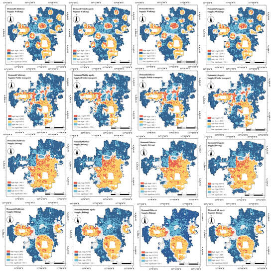 Using the Geoda 2.1 platform, a bivariate local spatial autocorrelation analysis of park accessibility and residential demand was conducted to reveal the characteristics of the supply–demand matching of green park spaces in built-up areas. The spatial correlation between these two factors is shown in Figure 10. The high–high (h–h) type indicates residential grids with both high accessibility and a high population; the high–low (h–l) type represents grids with a large population but low accessibility; the low–high (l–h) type shows grids with high accessibility but a small population; and the low–low (l–l) type indicates both low accessibility and low population density in the residential grids. Within a 30 min travel threshold for walking, targeting the entire population and removing invalid data, 6.57% of the parcels are classified as h–h, 54.37% as l–l, 20.32% as l–h, and 18.74% as h–l. The most prominent issue is found in the outer ring surrounding the city park, where the population density is the highest in Hefei. The imbalance between supply and demand is minimal for older adults in this travel mode, possibly because they consider walkable access to UGSs within a certain threshold important when choosing their residence. For travel based on public transit, targeting the entire population and removing invalid data, 7.04% of the parcels are categorized as h–h, 53.88% as l–l, 13.10% as l–h, and 25.98% as h–l. The distribution is centered along the axis connecting Shufengwan Park and Luogang Park, with supply–demand matching ranging from excellent to moderate, mainly due to the abundance of public transit routes near large parks. Regarding driving, targeting the entire population and removing invalid data, 0.56% of the parcels are classified as h–h, 47.45% as l–l, 33.72% as l–h, and 18.27% as h–l. The distribution trend shows upper and lower layering, with the southern region having well-developed road infrastructure and many parks but a low population, resulting in good performance under this mode of travel. For cycling, targeting the entire population and removing invalid data, 6.91% of the parcels are categorized as h–h, 51.53% as l–l, 23.55% as l–h, and 18.01% as h–l. Areas with a high distribution of urban greenways often show more outstanding performance under cycling as a mode of transportation.