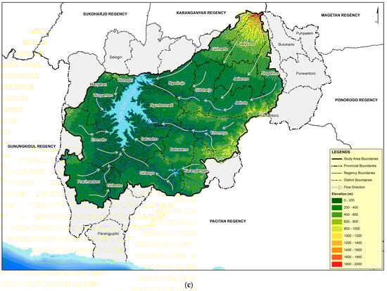 The study area is situated in the Central Java Province on the island of Java, Indonesia (Figure 1a). It forms part of the upstream Bengawan Solo River Basin, as illustrated in Figure 1b, where water flow predominantly heads north toward the Java Sea, while some flows south toward the Indian Ocean. This flow direction is influenced by the topography and slope gradient, moving from upstream to downstream. The boundaries of the study area align with the river basin which serves as the water catchment area for the Wonogiri Multipurpose Reservoir (WMR) (Figure 1c). Administratively, the area encompasses 193 villages across 20 districts, all located within Wonogiri Regency, Central Java Province, Indonesia (Figure 1d).