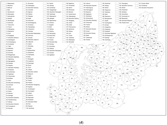 The corresponding author can provide the data from this study upon request. The information is available on the websites of the Statistics Agencies, more specifically, the websites of Statistics Agencies for provinces, regencies, and municipalities. No single dataset was created from online data collection. To acquire case-specific data, e.g., Wonogiri Regency, please visit https://jateng.bps.go.id (accessed on 16 February 2023) (Statistics Agency of Jawa Tengah Province) or https://wonogirikab.bps.go.id (accessed on 16 February 2023) (Statistics Agency of Wonogiri Regency). Our data are not publicly available because they were obtained through an agreement between IPB University and the Central Statistics Agency.