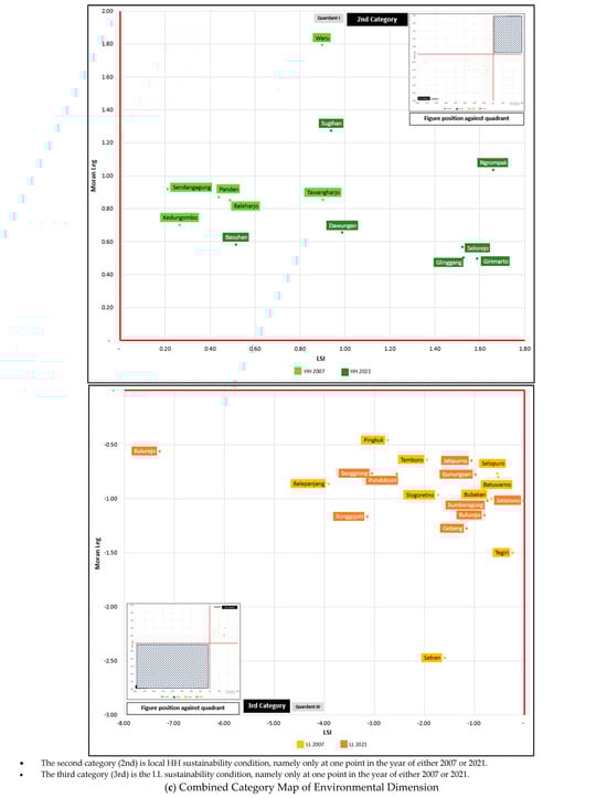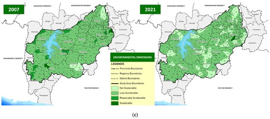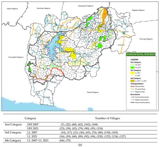 The combination of spatial associations in the environmental dimension shows that no villages fall into the first category. For the second category, it is located in the east, southeast, south, southwest, and northeast. This indicates that there is a high environmental sustainability association in several villages in the catchment area. However, it looks different from the sustainability association category 3, which is in a village that is relatively far from the highway and is a catchment area of the WMR. Category 4, which has a low sustainability association from 2007 to 2021, is in a village that is a catchment area of the WMR (Figure 4c and Figure 5c).