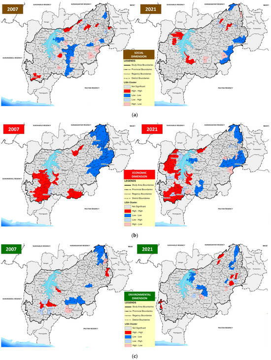 In 2007, the spatial distribution of high–high (HH) category villages for the social dimension was concentrated in the east, southeast, and southwest of the Wonogiri Multipurpose Reservoir (WMR). By 2021, these HH category villages were found in the southwest, east, southeast, and northwest regions of the WMR, indicating that areas with high sustainability values are clustered together. Conversely, in 2007, the low–low (LL) category villages were situated in the east, southeast, southwest, and northeast of the WMR. In 2021, the LL category was present in the east, northeast, and southwest, demonstrating that the villages with low sustainability values surrounded one another (Figure 3a).