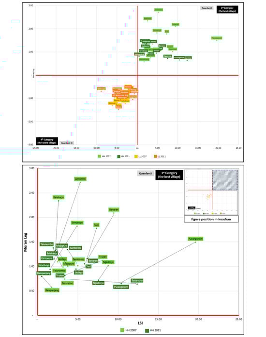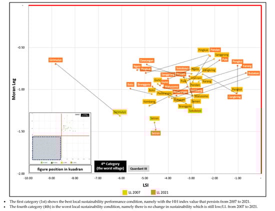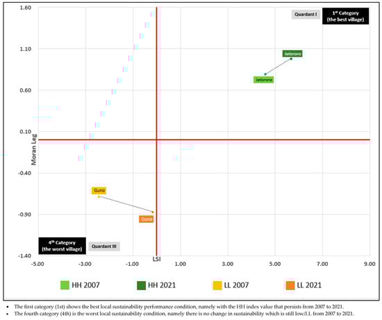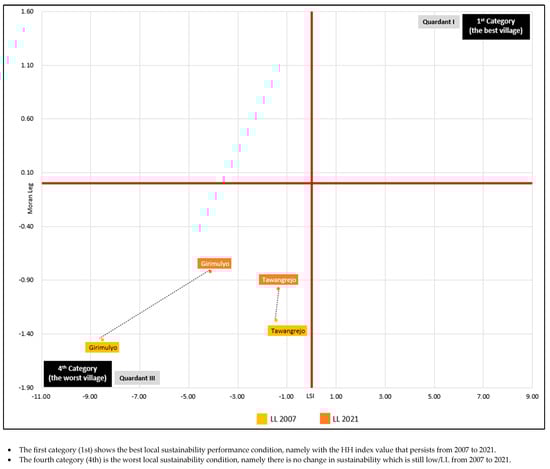 According to the combined category map in Figure 4, Figure 5 illustrates the categories in a quadrant format. Category I villages, deemed the best, maintained a high–high (HH) sustainability association from 2007 to 2021 and are located in Quadrant I (top right). In contrast, Category IV villages, considered the worst, exhibited a low–low (LL) sustainability association during the same period, placing them in Quadrant III (bottom left). Categories II and III consist of villages that demonstrated sustainability association conditions in just one year of either HH in 2007 or 2021 (Category II) or LL in 2007 or 2021 (Category IV).