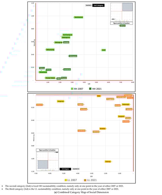 The combination of spatial associations in the social dimension shows that the first category is located to the east of the WMR. For the second category, it is located in the southeast, southwest, northwest, and northeast of the WMR. This indicates that there is a high social sustainability association around the urban areas that are served by district and provincial roads. It looks different from categories 3 and 4 which are in villages that are relatively far from highways such as Guno Village which have a constant low sustainability association value from 2007 to 2021 (Figure 4a and Figure 5a).