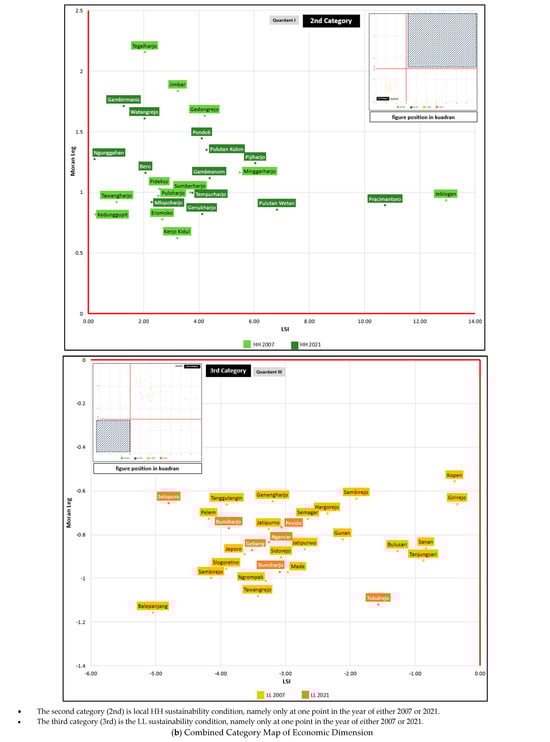 The combination of spatial associations in the economic dimension shows that the first category is located in the southeast, south, southwest of the WMR. For the second category, it is located in the southeast, southwest, northwest, and northeast. This indicates that there is a high economic sustainability association around the urban areas that are passed by district and provincial roads. It looks different from the sustainability of categories 3 and 4, which are in the villages that are relatively far from road and catchment area of the WMR, and which have a constant low sustainability association value from 2007 to 2021 (Figure 4b and Figure 5b).