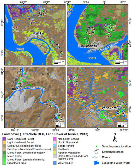 The study areas of Igarka and Turukhansk are located in the Yenisei River basin within the gently undulating moraine and plain of the Late Pleistocene glaciation [42] with an elevation range of 30–45 m a.s.l. (above sea level). The third area studied, surrounding the Tura settlement, is in the middle basin of the Lower Tunguska River. The Central Siberian Plateau in this region has an elevation range of approximately 140 to 600 m a.s.l. and is formed by Triassic igneous basalt. The last study region near the Vanavara settlement occupies the southern part of the Tungusky State Nature Reserve in the middle basin of the Podkamennya Tunguska River. The topography is represented by a hilly plateau (400–500 m a.s.l.) of Palaeozoic sandstones and Triassic effusive rocks, covered with their eluvium.