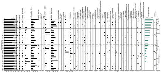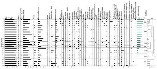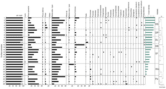 Percentage pollen diagram of surface samples from Igarka area. Habitats: DL—dense larch forests, OB—open birch forest, OS—open spruce forests, OL—open larch forest, Wo—open woodlands, BA—burnt area, Pe—peatlands.