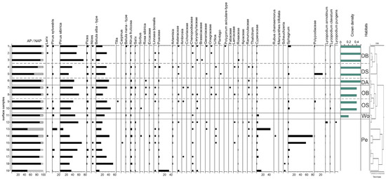 Percentage pollen diagram of surface samples from Turukhansk area. Habitats: DB—dense birch forests, DS—dense spruce forests, DA—dense aspen forest, OB—open birch forest, OS—open spruce forests, Wo—open woodlands, Pe—peatlands.