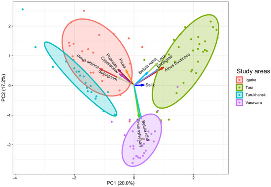 The share of variance explained by the first and second PCs (principal components) was 20% and 17.2%, respectively. The biplot in Figure 7 shows that temperature regime (PC1) and climate continentality (PC2) are apparently critical factors affecting the distribution of vegetation and pollen assemblages in the permafrost zone of Central Siberia. The PCA results revealed that the pollen assemblages are clearly separated into three distinct clusters corresponding to the study regions: the southernmost study region in Central Siberia (Vanavara) with the prevalence of Betula alba and Pinus sylvestris, the center study region in Central Siberia (Tura) with Alnus fructicosa, Larix, Betula nana, Ericaceae and Yenisei Siberia (Igarka and Turukhansk) with Pinus sibirica, Picea, Poaceae, Cyperaceae, Sphagnum. Despite the proximity of the pollen assemblages at Igarka and Turukhansk, their differences are determined, emphasizing a positive correlation between pollen and vegetation.