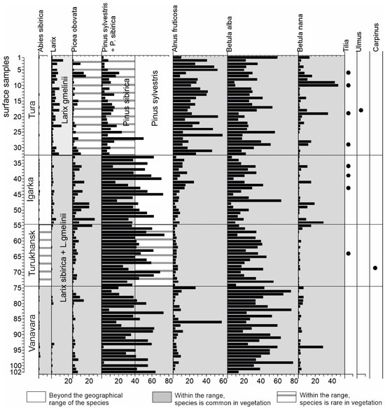 Pinus pollen is present in all surface samples examined. The growing area of Pinus sibirica covers the entire study region (Figure 1). In Tura and Igarka, Pinus sibirica is close to the range boundary [44]. However, according to our field observations, Pinus sibirica is a common tree in Igaraka, but very rare in Tura due to the more continental climate. The northern limit of the range of Pinus sylvestris in the middle reaches of the Nizhnyaya Tunguska River is located about 150 km west of the Tura region and crosses the valley of the Yenisei River at Turukhansk. (Figure 1). Our data showed that in regions outside the geographical range of the pines, the proportion of pollen from both pine species reaches its maximum values in sampling plots located in treeless peatlands and in open woodlands or burnt areas. As several pollen studies have shown, due to the filtering effect of the canopy and the high pollen productivity of the trees, the contribution of wind-transported pollen from distant areas is significantly lower under the forest canopy than in open habitats [11,13,19,64]. Therefore, the proportion of pine pollen increases in treeless or very low canopy density plant communities [65]. Some researchers even use Pinus pollen content or the Pinus/Larix ratio as an indicator of increasing landscape openness in Arctic regions [20].