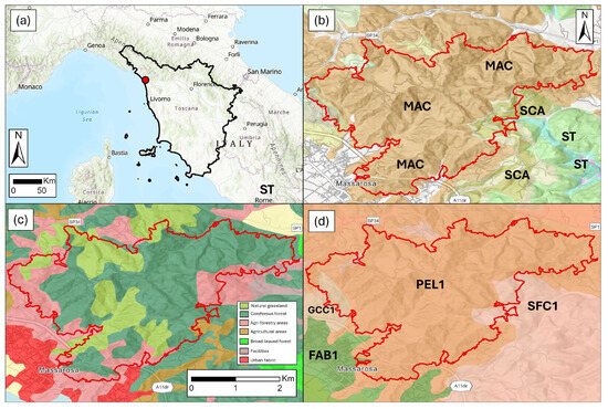 (a) Location of the Massarosa wildfire area within the Tuscany region (red dot). (b) Geological setting of the study area (MAC = Macigno Formation; SCA = Scaglia Toscana Formation; ST = Serie Toscana group). (c) Land cover distribution. (d) Pedological association (PEL1 = slighlty deep soils with loamy textures and well-drained structure; SFC1 = shallow depth soils with gravelly and pebbly textures and well-drained structures; GCC1 = slightly deep soils with loamy textures and well-drained structures; FAB1 = deep soils with sandy textures and well-drained structures). The burned area is highlighted with the red polygon.