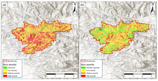 In Figure 2, the burn severity maps calculated from the values are depicted. Figure 2a represents the “five days after the fire” scenario while Figure 2b represents the “one year after” scenario. From Figure 2a, the impact of the wildfire is clearly visible since most of the study area was classified with either a medium or high burn severity, while only a few areas were considered to have been slightly affected by the fire (low burn severity) and just a few spots remained unburned. After a year (Figure 2b), there was a shift towards a less serious scenario, since a decrease in highly damaged areas is evident. However, some sectors classified as high-burn-severity-affected are still present within the area.