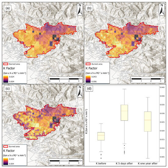 K factor maps of the Massarosa wildfire area: (a) before the wildfire occurrence; (b) five days after the wildfire occurrence; (c) one year after the wildfire occurrence; (d) boxplot comparison of the three scenarios.