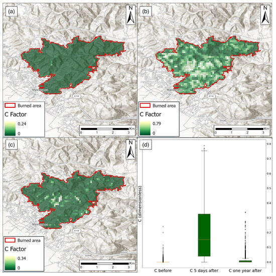 C factor maps of the Massarosa wildfire area: (a) before the wildfire occurrence; (b) five days after wildfire occurrence; (c) one year after wildfire occurrence; and (d) boxplot comparison of the three scenarios.