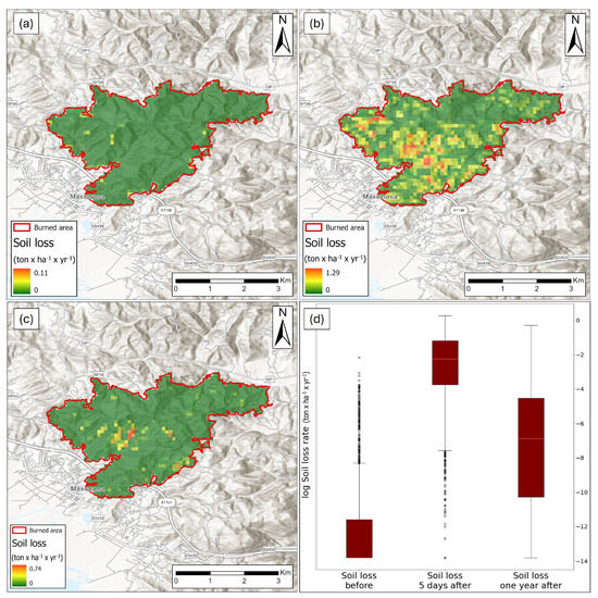 Soil loss map of the Massarosa wildfire area: (a) before the wildfire occurrence; (b) five days after wildfire occurrence; (c) one year after wildfire occurrence; and (d) boxplot comparison of the three scenarios.