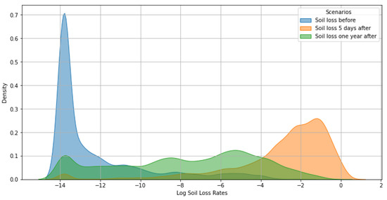 To better understand the change in soil erosion rate distribution, a Kernel density estimation for the three scenarios was evaluated (Figure 8). The use of a logarithm of soil erosion rates allows us to highlight the differences between the three scenarios. Upon analyzing the graph in Figure 8, the differences between pre-fire and immediately after scenarios are focused on a general increase in the absolute values and an increase in the area-under-the-curve width after five days (density peak from 0.7 to 0.25), indicating a slight change in data variability. The mid-term scenario (one year after) presents highly dispersed data compared to the previous scenarios that virtually cover the whole value’s range between the baseline and immediately after distribution, indicating a time-dependent response typology.